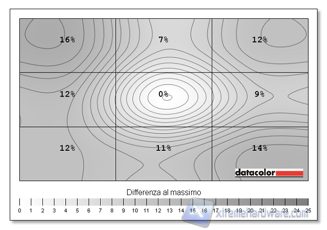 Suddividendo lo schermo in nove rettangoli, abbiamo misurato con il colorimetro l’uniformità della luminosità e dei colori. La differenza massima registrata è risultata pari al 16%, con una media di 11,6%, per quanto riguarda la luminosità, mentre per il colore, il Delta-E maggiore è stato di 2,1, con una media di 1,3.